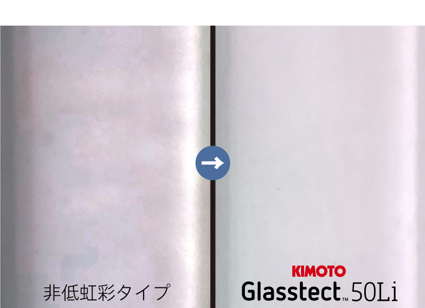 KIMOTOのウィンドウフィルムは膜の厚みと薄さのバランスを調整し反射を緩やかにすることで虹彩を低減し、昼光色(三波長)蛍光灯を使用した時に目立ちやすい光の反射ムラ(虹彩)を抑えることができます。